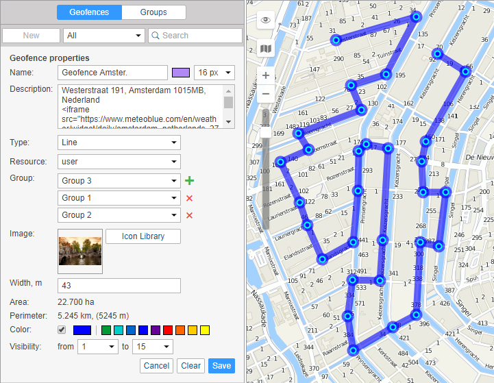 This field is optional. The description is displayed in the geofence tooltip. It can also be added to the geofence name if the geofence is used as the address source in reports. When you create a geofence, the description is filled in automatically with the address information taken from the first point you map. However, you can edit or simply delete it. The text should not contain more than 10,000 characters. You can use html (including iframe) tags in descriptions in order to format text or get images from other sites. For example, you can embed videos from web cameras, get photos of crossroads, load information about the weather or exchange rates, and so on.
